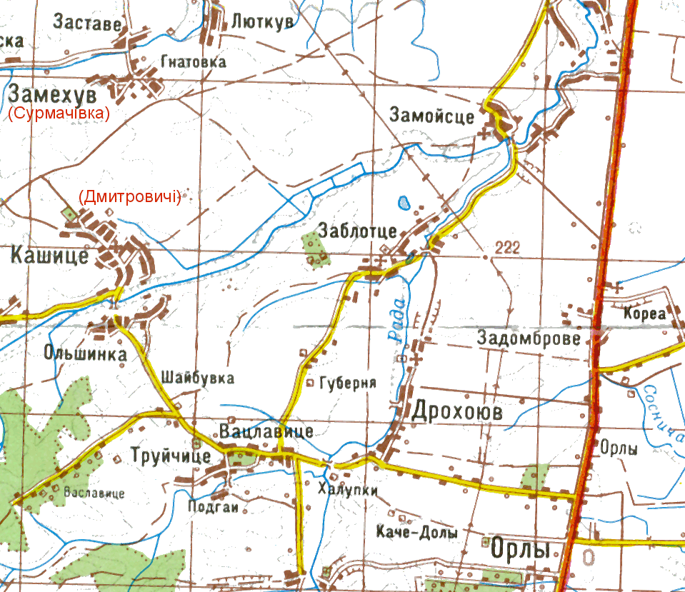 Карта (Заблотце)Розмір зображення: 959:829 піксел Карта Київської військово-картографічної фабрики, масштаб 1:100000, аркуш 88, друк 2000 р. (за матеріалами 2000 р.). |