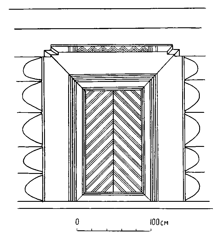 Село Черная Тиса. Хата XIX в. ДверьРозмір зображення: 759:800 піксел Джерело: Макушенко П. И. Народная деревянная архитектура Закарпатья (18 – начала 20 века). – Москва: Стройиздат, 1976 г., с. 39. |