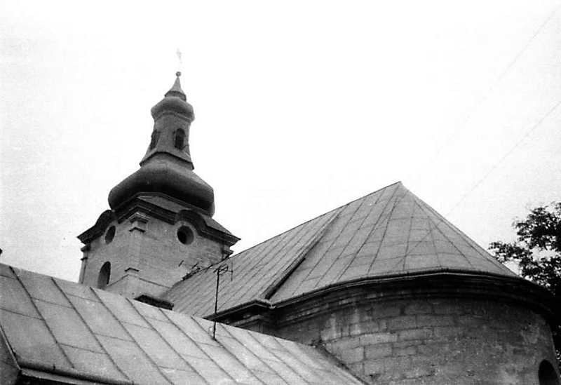 1991 р. Верх костелу. Вигляд з позиції А2Розмір зображення: 800:549 піксел 1991 р. 11 липня. Фото М.І.Жарких. Негатека, № 673-31. |