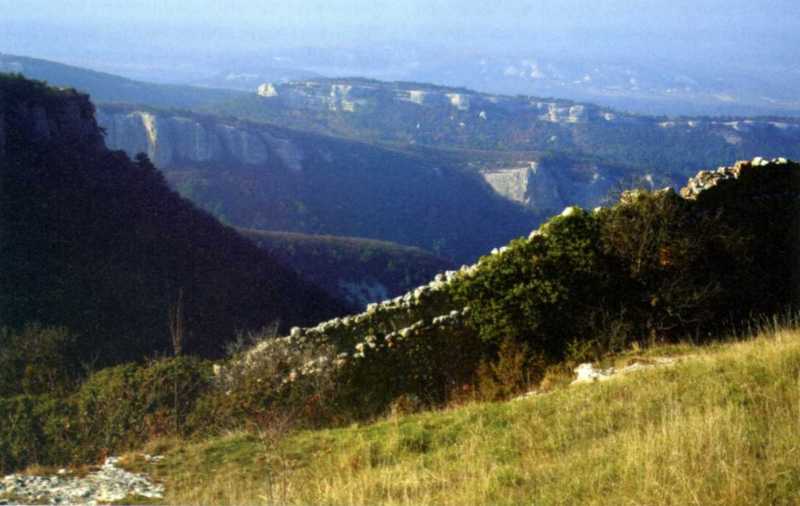 На передньому плані – оборонний мур. Фото О. Гайворонського, 2014 р. [Гайворонський О. Країна Крим. – К.: Майстер книг, 2017 р., c. 244]