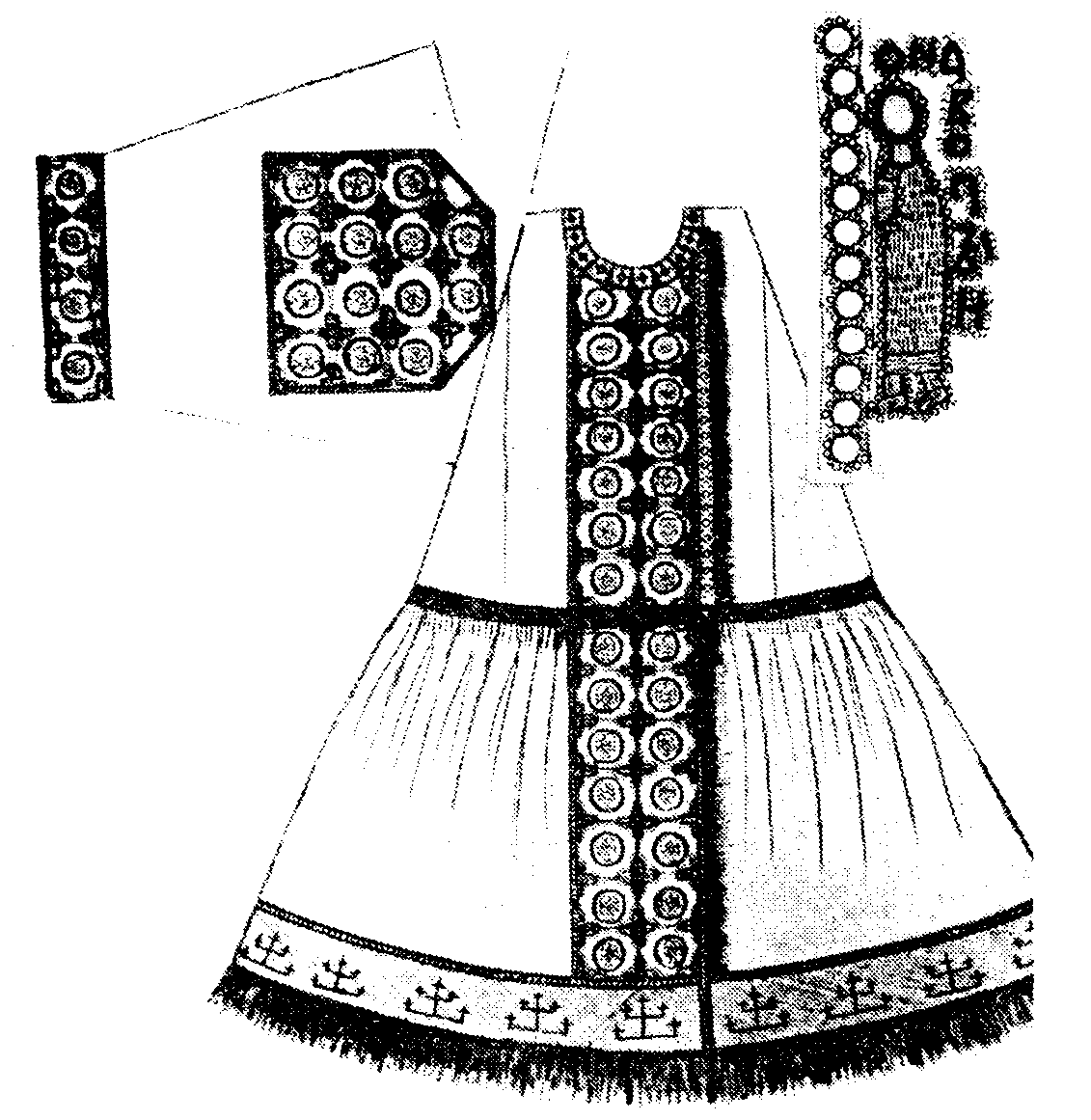 Реконструкція одягу похованого. Справа - фігура людини з грецьким написомРозмір зображення: 1131:1161 піксел Джерело: Gold der Steppe: Archaeologie der Ukraine. – Schleswig: 1991, S. 274. |
