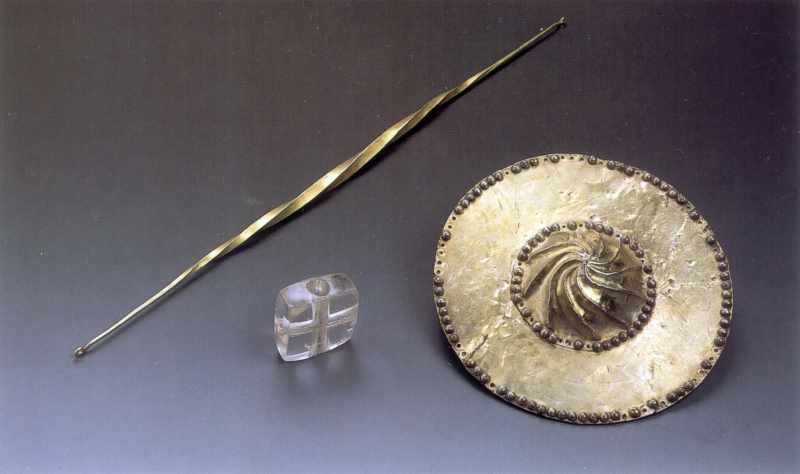 Предмети з Чінгульського кургануРозмір зображення: 800:474 піксел Джерело: Gold der Steppe: Archaeologie der Ukraine. – Schleswig: 1991, S. 417, № 192, 198, 200. |