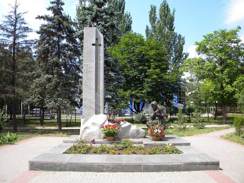 У сквері (на території колишнього стадіону заводу ім. Баранова) поховано 6600 мирних громадян, розстріляних німецькими загарбниками у 1941 – 1943 під час тимчасової окупації міста. У 1994 проведено повну реконструкцію: гранітна брила на могилі замінена гранітним пілоном у вигляді православного хреста. На лицьовому боці пілона викарбувано меморіальний напис. Ліворуч – скульптура старої жінки з залізобетону, окута міддю.