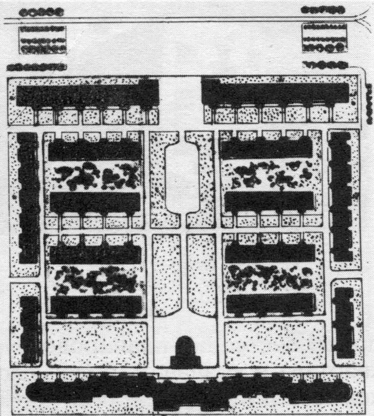 Центральна вісь кварталу проектувалася перпендикулярно вулиці і була широкою, зеленою зоною. На червону лінію виходили два однакових, симетрично розташованих, триповерхових житлових будинки. Їх торцеві частини виходили на центральну вісь кварталу, мали підвищення до 4-х поверхів з вбудованоприбудованими об’ємами магазинів. На завершенні вісі, в глибині двору, була запроектована будівля громадської бібліотеки.