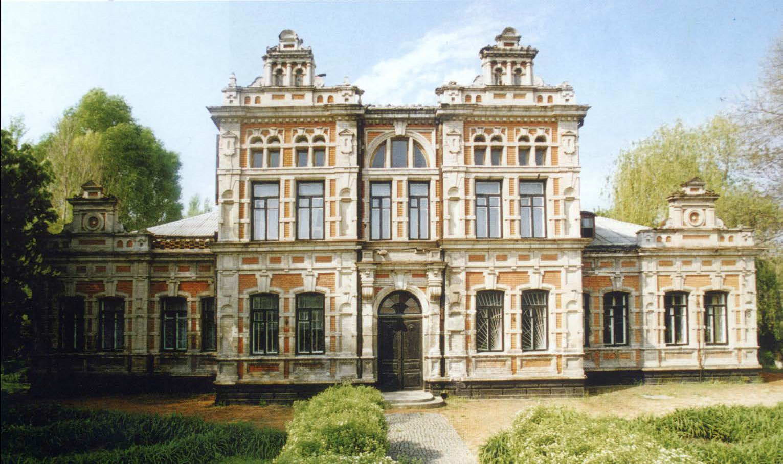 Центральна частина і бічні крила підкреслені кутовими ризалітами. Створений ефект конструктивної структури будівлі не маскується, а утворює на зовнішній поверхні стіни своєрідний візерунок з пересічних вертикальних і горизонтальних ліній з декоративною обробкою. Фасади будинку викладені з теракотової і світло-бежевої цегли, що робить його привітним, немов випромінюючим сонячне тепло. Вікна – найрізноманітнішої форми і величини: прямокутні, напівциркульні, зі злегка зігнутою під замковим каменем перемичкою з витонченими палітурками рам, групуються парами і органічно входять в ритм фасадів.
