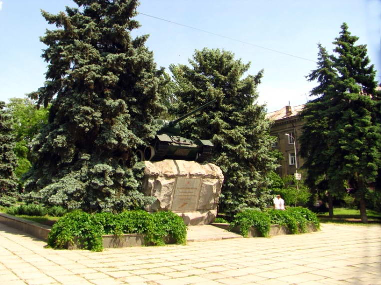 Пам’ятник встановлено на площі в сквері 9 травня 1960. На постаменті з гранітних блоків встановлено танк Т-34. На постаменті гранітна меморіальна дошка з посвятою.