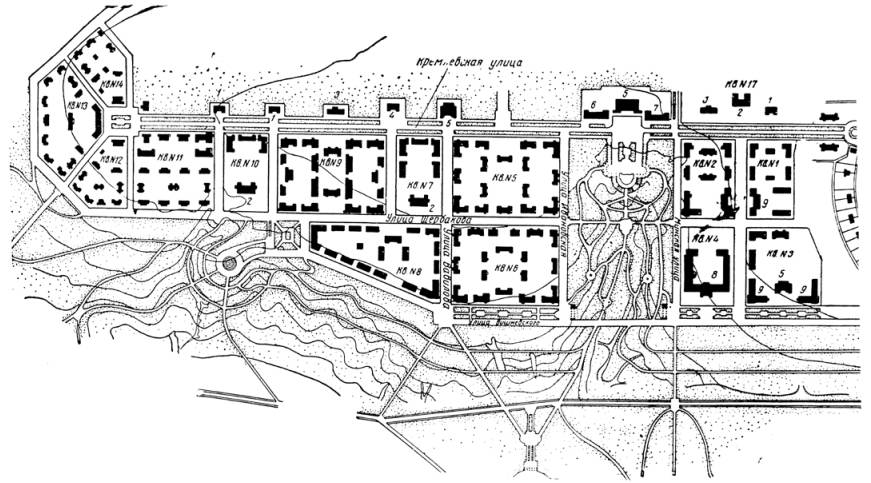 Зокрема, загальна кількість поперечних вулиць перевищує життєво необхідне, але при цьому досягається високий рівень комфорту і зручностей. При великій різноманітності планувальних прийомів квартальної забудови важко уявити, що авторами проекту використані типові проекти всього двох серій.