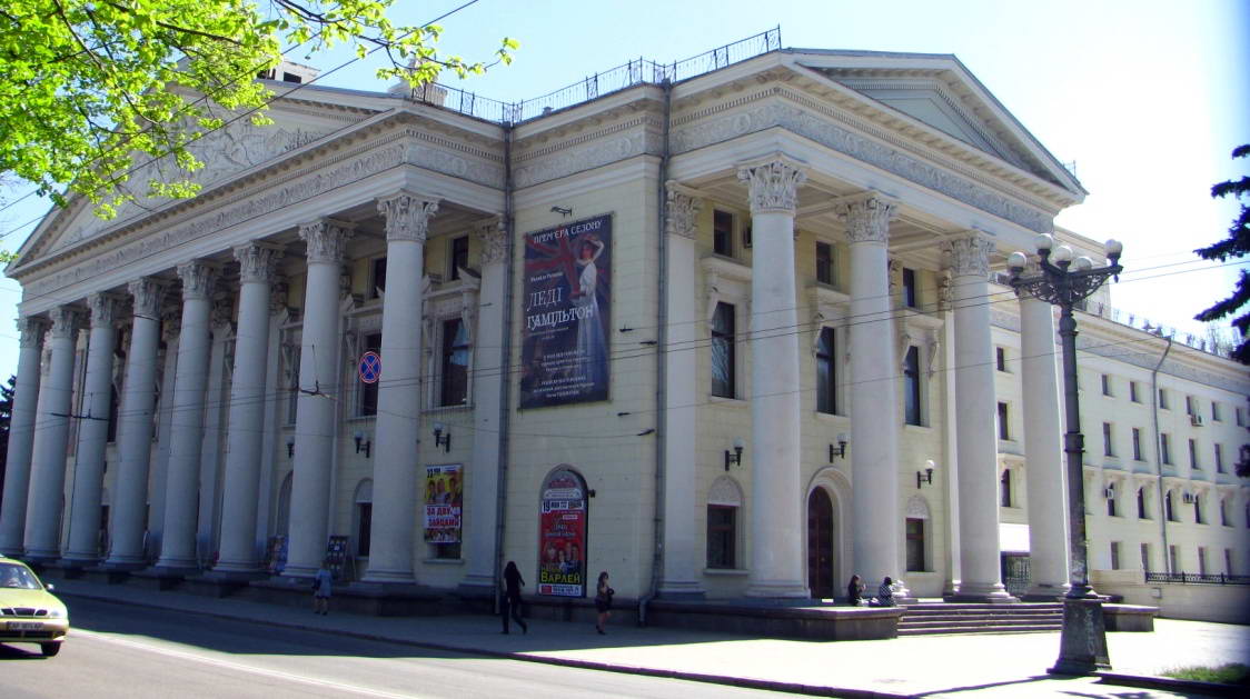 Зведений на місці зруйнованої під час Другої світової війни старої споруди, пристосованої у 1930-і рр. під театр. За проектом відбудови, розробленим архітектором С. Фрідліним, театральний будинок було значно розширено у відповідності до функціональних вимог. Недостатня ширина ділянки, де збудовано театр, примусила розмістити театральну площу по інший бік центрального проспекту. Частково виправити цей недолік намагалися створенням, окрім головного, ще двох додаткових входів на бічних фасадах.