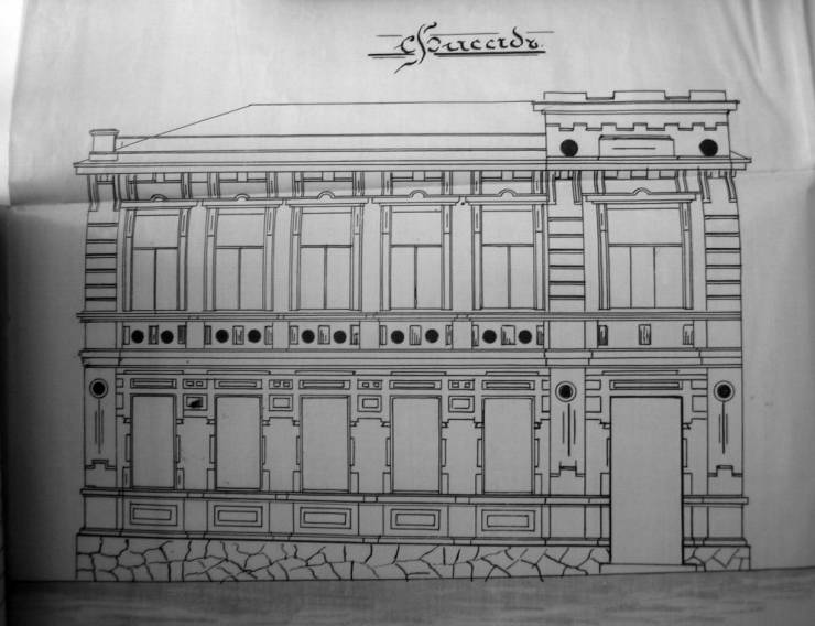 Проект фасадуРозмір зображення: 740:568 піксел Джерело: Матеріали до багатотомного «Зводу пам’яток історії та культури України»: Запорізька область. – К.: 2016 р., , с. 295-1. |