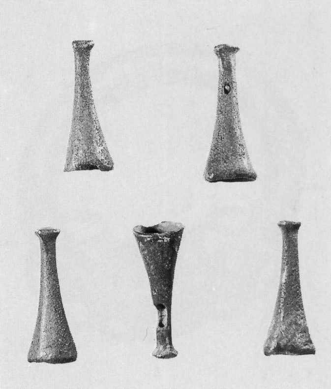 Бронза. Висота 4.4 см, діаметр основи 1.1 – 1.8 см, діаметр верху 0.8 см.