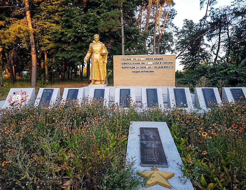 Братська могила радянських воїнів 1943 р.Розмір зображення: 800:618 піксел Фото з сайту (опубліковано 11.09.2019 р.). Тут поховані воїни, загиблі при вигнанні німців із села. |