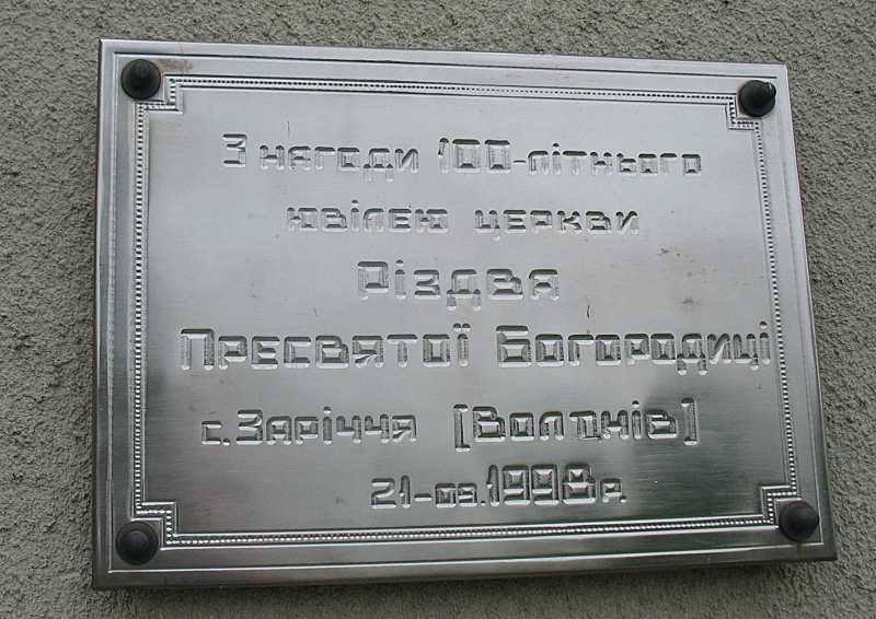 Напис: «З нагоди 100-літнього ювілею церкви Різдва пресвятої богородиці с. Заріччя (Волцнів) 21.08.1998 р.».