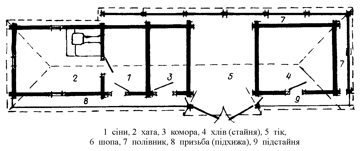 1 – сіни, 2 – хата, 3 – комора, 4 – хлів (стайня), 5 – тік, 6 – шопа, 7 – полівник, 8 – призьба (підхижа), 9 – підстайня.