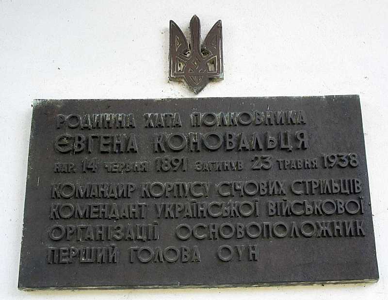Напис: «Родинна хата полковника Євгена Коновальця. Нар. 14 червня 1891, загинув 23 травня 1938. Командир корпусу січових стрільців, комендант Української військової організації, основоположник і перший голова ОУН».