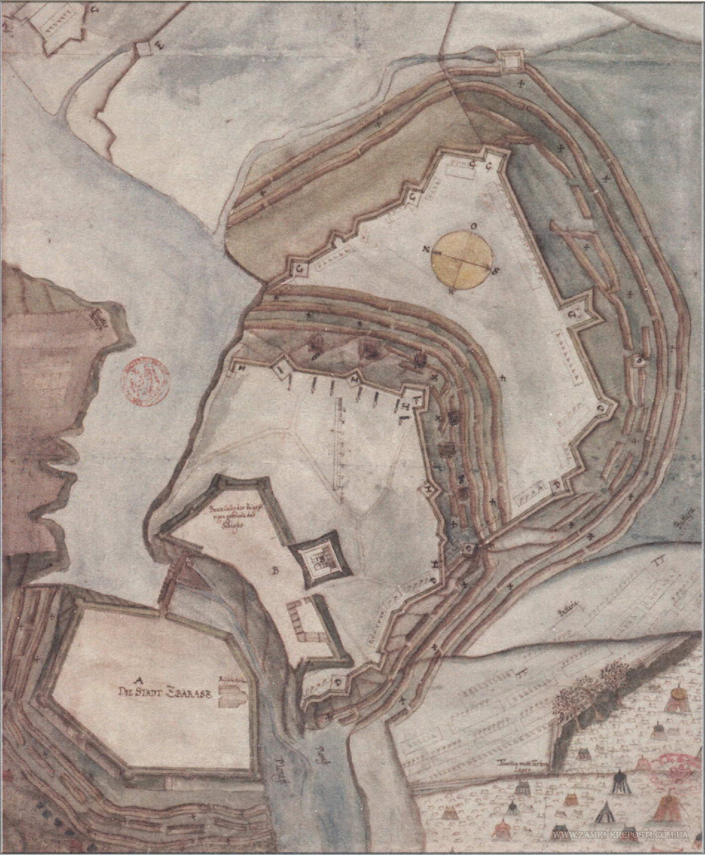 1649 р. План облоги ЗбаражаРозмір зображення: 1422:1725 піксел План зберігається у Берліні, опублікований Филипом Гавриленком 6.09.2018 р. (Збараж: «Берлинский план» 1660 года (копия с плана 1649 года) (+ пояснення) |