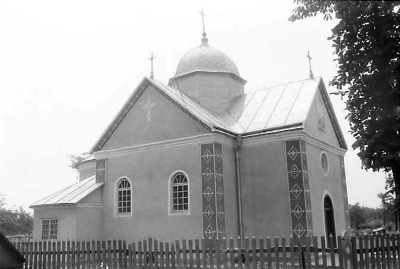 Церква (Вознесіння ?): орієнтація вівтаря 110°, на околиці села, до бічної вулиці – А4, головний вхід в позиції С3, дерев. дзвіниця в позиції А3. Спостереження М.І.Жарких 18.07.1991 р.