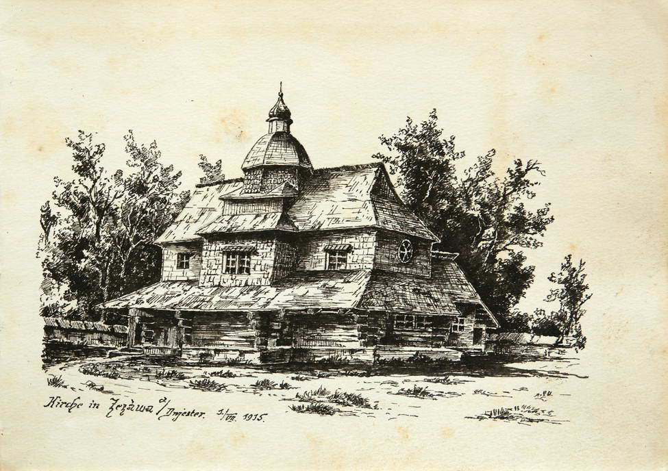 Вже 1 липня 1915 року Е. Маєр намалював пером церкву в Жежаві над Дністром, підписавши «Kirche in Zezawa am Dnjester 1/VII 1915»¹⁰. Ця церква Св. Параскеви в селі Заліщицького району, яке в радянський час перейменоване на Зелений Гай, була збудована у 1784 році і збереглася донині. Чудовий і дуже детальний малюнок зображує церкву з південно-східного боку. Тут ще відсутній великий непропорційний присінок, добудований у міжвоєнні роки. На жаль, ця церква, нині не чинна, навіть не внесена в реєстр пам’яток України.