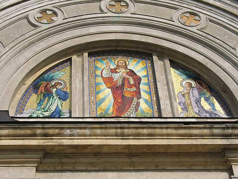 2006 р. Мозаїка «Христос з ангелами»Розмір зображення: 800:600 піксел Мозаїка в тимпані західного фасаду. Фото Зенона Боровця і Богдана Тхора, 20 серпня 2006 р. |