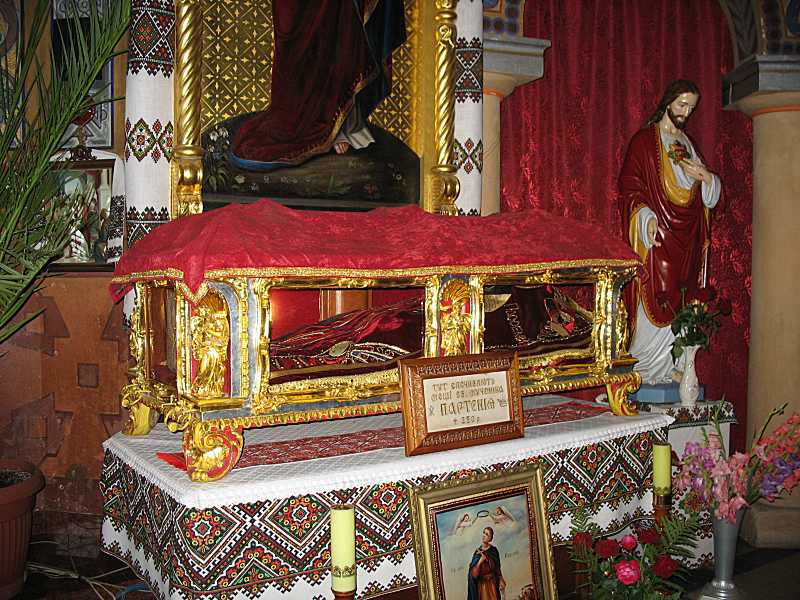 Рака встановлена перед західною площиною південно-східного підкупольного стовпа. Напис на табличці: «Тут спочивають мощі св. мученика Парфенія + 250 р.»