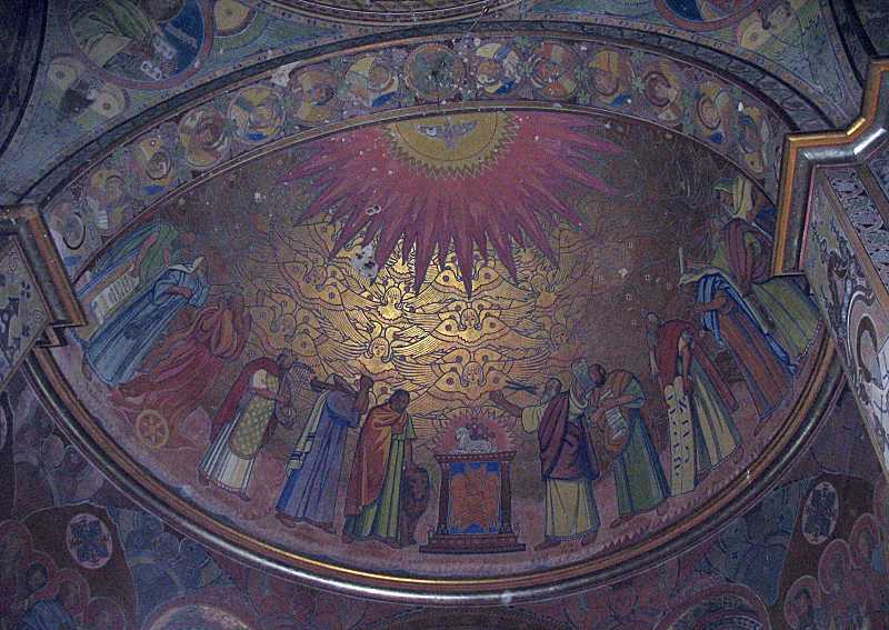Поклоніння агнцу (?)Розмір зображення: 800:567 піксел Стінопис конхи вівтаря. Фото Зенона Боровця і Богдана Тхора, 20 серпня 2006 р. |