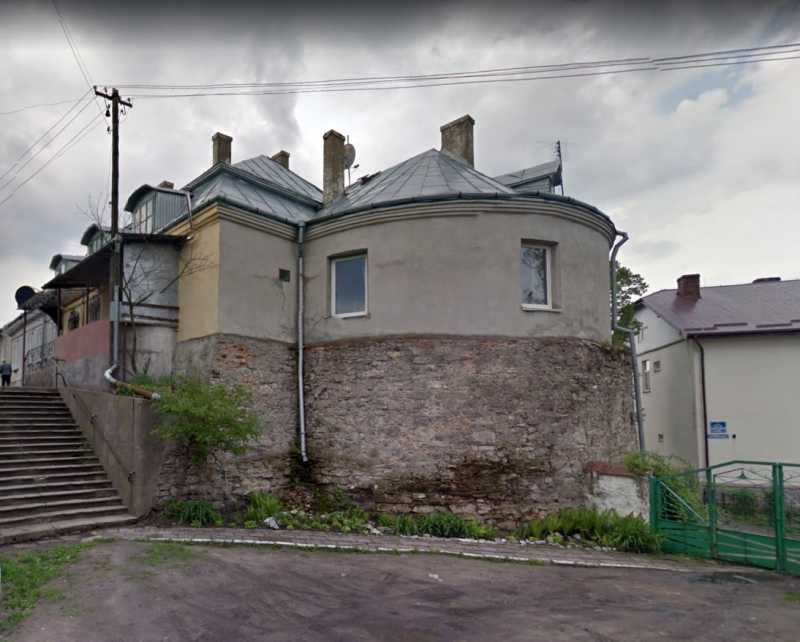 Північно-західна баштаРозмір зображення: 800:642 піксел Фото з вуличних панорам Google (травень 2015 р.) Провулок Горького, 13 (у 1985 р.) – у 2019 р. на жодному плані Жовкви не позначений, тільки сусідня вул. Василіянська. |