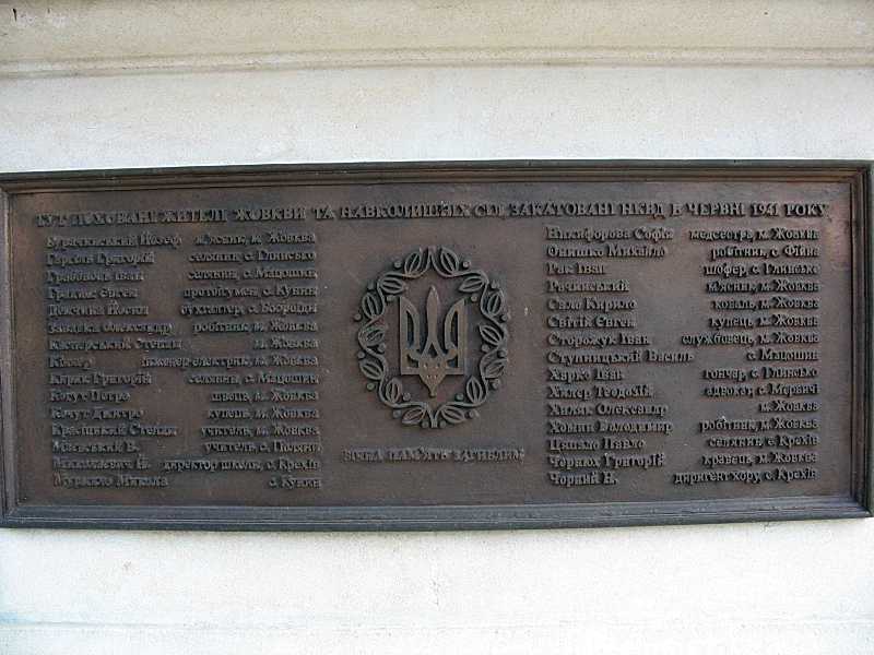 Напис: «Тут поховані жителі Жовкви та навколишніх сіл, закатовані НКВД у червні 1941 р.:
