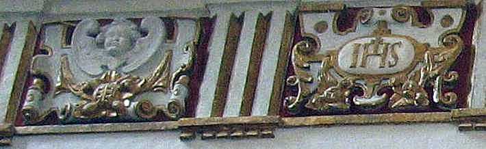 Декоративні вставки фризаРозмір зображення: 710:218 піксел Ліворуч – херувим, праворуч – монограма Ісуса Христа. Фото Зенона Боровця і Богдана Тхора, 1 вересня 2012 р. |
