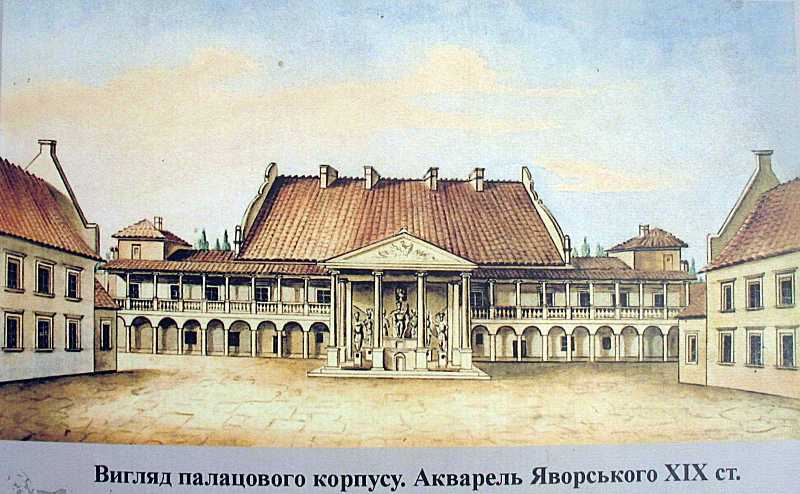 19 ст. Головний фасад палацуРозмір зображення: 800:494 піксел Фото Зенона Боровця і Богдана Тхора (1 вересня 2012 р.) з акварелі Яворського 19 ст. |