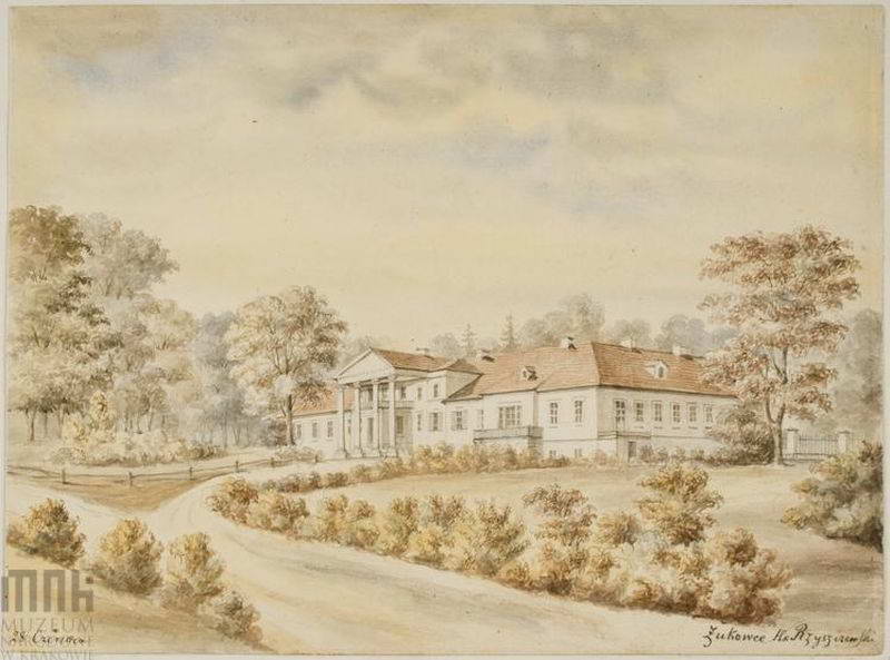 Pałac Rzyszczewskich dawniej Czartoryskich. Widok od strony podjazdu. Pałac parterowy, wysoko podpiwniczony, z portykiem kolumnowym w wielkim porządku i tarasem w dwukondygnacjowej części środkowej. 1862 – 1876. Dat.: 28 Czerwca. Napis: Żukowce Hr. Rzyszczewski; napis na podkładzie: Wołyń Żukowce, – pałac. Rys. ołówkiem podmalowany akwarelą, 20,5x27,7. III-r.a. 4307 (Teka Wołyń). [Katalog rysunków architektonicznych ze zbiorów Muzeum narodowego w Krakowie. 1. Rysunki Napoleona Ordy / Opracowały Zofia Kucielska i Zofia Tobiaszowa. – Warszawa: Państwowe wydawnictwo naukowe, 1975, Nr. 881]