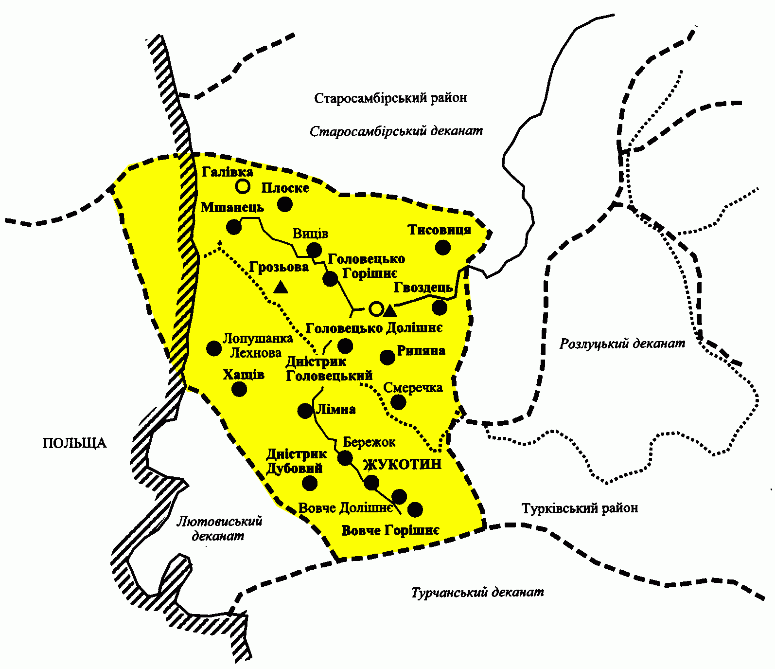 Картосхема деканату за В.СлободяномРозмір зображення: 1594:1375 піксел Джерело: Слободян В. Церкви України: Перемиська єпархія. – Льв.: 1998 р., с. 201. |