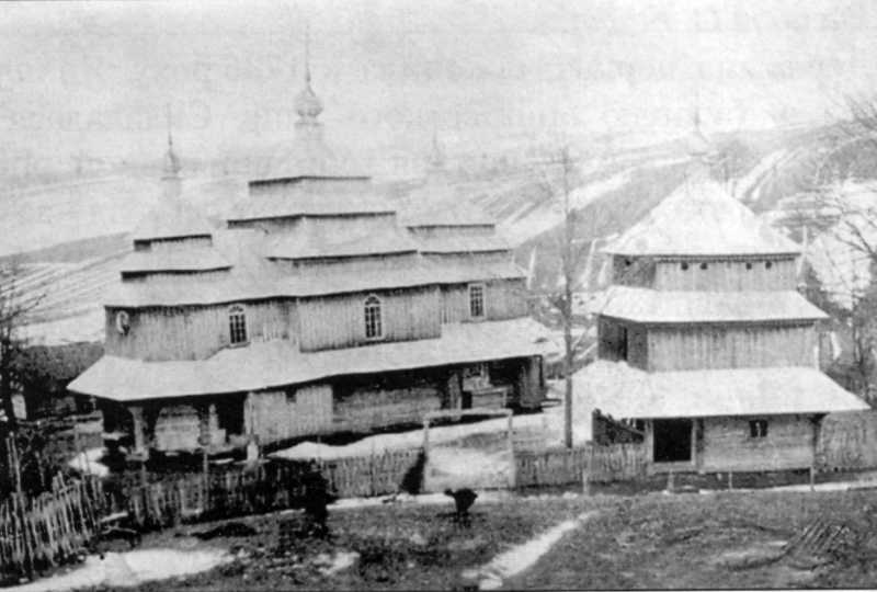 Церква бойківського типу, збудована в 1876 році на місці попередньої, яка згоріла 1873 року. Складалася з трьох прямокутних зрубів, з них зруб нави був ширший. Наву завершував чотирибічний пірамідальний верх із трьома заломами, бабинець – такий самий з двома заломами, а вівтар – восьмибічний верх також із двома заломами. Усі верхи вінчали сліпі ліхтарі з маківками. Оперізувало будівлю широке піддашшя, сперте на випусти вінців зрубів. 14 вересня 1939 року церкву спалили польські вояки разом із селом.