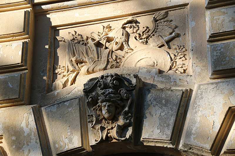 2016 р. Рельєфна вставка (зброя) і маскаронРозмір зображення: 800:533 піксел Над вікном, що праворуч від ганку. Фото Зенона Боровця і Богдана Тхора, 17 липня 2016 р. |