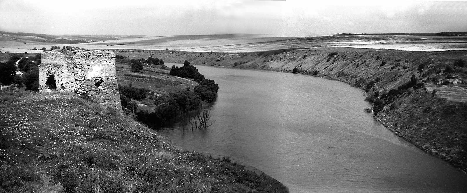 1991 р. Панорама р. Жванчик з баштою. Вигляд зі сходуРозмір зображення: 1600:664 піксел 1991 р. 23 липня. Фото М.І.Жарких. Негатека, № 695-24+6. |