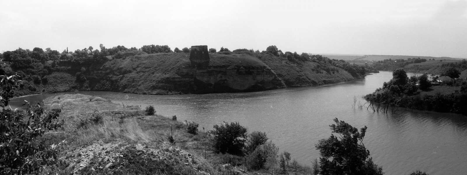 1991 р. Панорама замку і р. Жванчик з півночіРозмір зображення: 1600:601 піксел 1991 р. 23 липня. Фото М.І.Жарких. Негатека, № 699-12+3. |