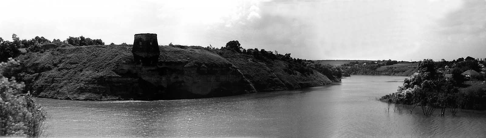 1991 р. Панорама замку і р. Жванчик з півночіРозмір зображення: 1600:455 піксел 1991 р. 23 липня. Фото М.І.Жарких. Негатека, № 699-21+3. |