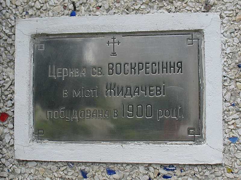 Напис: «Церква св. Воскресіння в м. Жидачеві побудована в 1900 році».