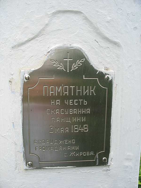 Напис: «Пам’ятник на честь скасування панщини 3 мая 1848. Споруджено громадянами с. Жирова».