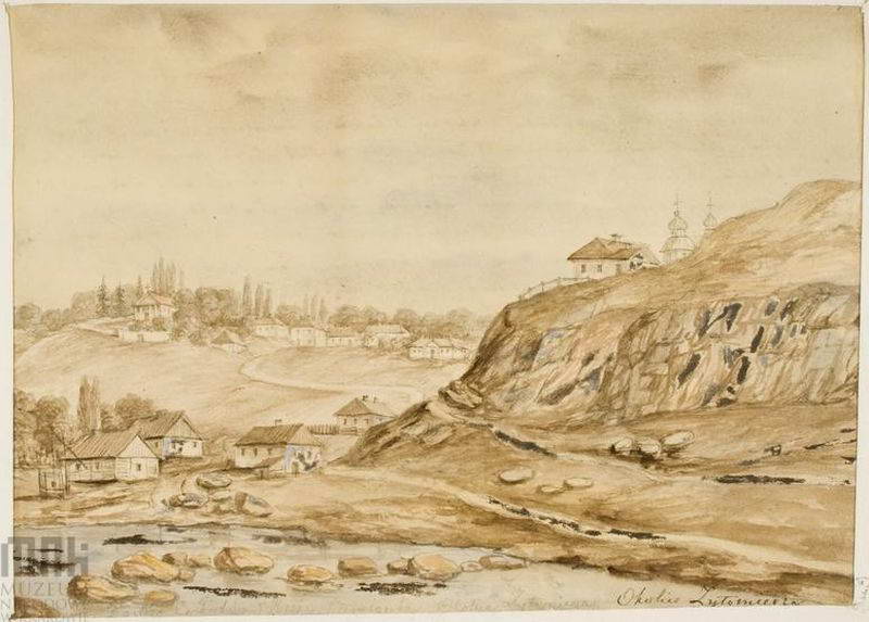 Widok ogólny od strony rzeki Kamionki z cmentarzem i kaplicą p.w. św. Stanisława. 1870. Napis: Do… [nieczytelne] Cmentarz; Rzeka Kamionka. Okolice Żytomierza. Okolice Żytomierza; napis na podkładzie: G. Wołyńska. Okolice Żytomierza. Rys. ołówkiem podmalowany akwarelą i gwaszem, 19,7x16,8. III-r.a. 4306 (Teka Wołyń). [Katalog rysunków architektonicznych ze zbiorów Muzeum narodowego w Krakowie. 1. Rysunki Napoleona Ordy / Opracowały Zofia Kucielska i Zofia Tobiaszowa. – Warszawa: Państwowe wydawnictwo naukowe, 1975, Nr. 891]