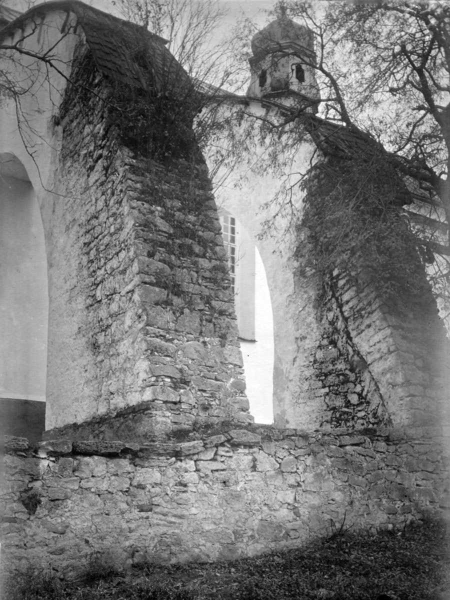 Контрфорси. Вигляд з позиції А3Розмір зображення: 900:1200 піксел Фото Стефана Таранушенка і Павла Жолтовського з експедиції Харківського музею українського мистецтва. 1920-і рр. (?) Опубліковано 7.01.2020 р. |