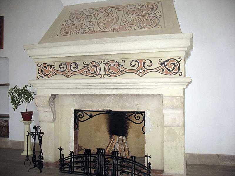 Камін Розмір зображення: 800:600 піксел Фото Зенона Боровця і Богдана Тхора, 29 листопада 2008 р. Вкладені елементи Загальний вигляд каміна Загальний вигляд каміна (2) (+) Гербова композиція на даху каміна Фрагмент живописного фризу Фрагмент живописного фризу (2)