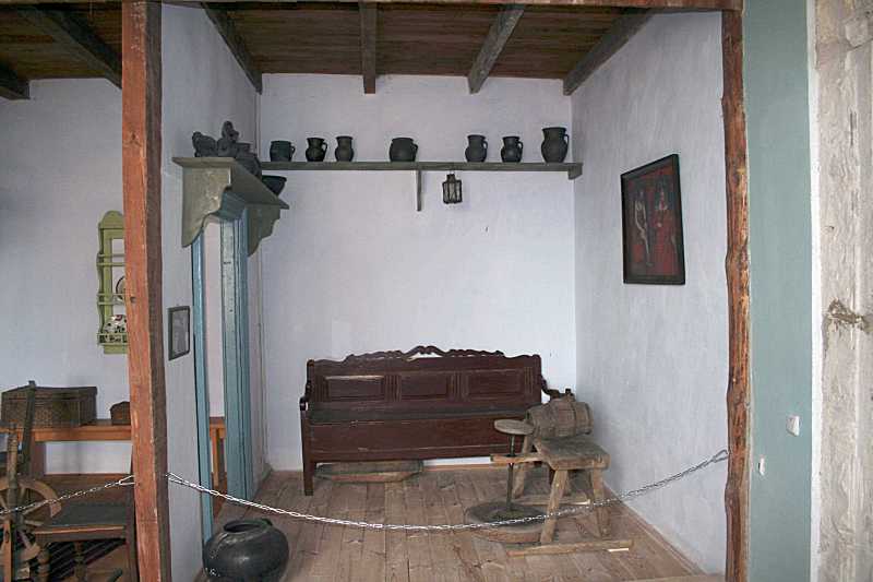 Інтер’єр сіней в заможній міщанській хатіРозмір зображення: 800:533 піксел Фото Зенона Боровця і Богдана Тхора, 13 серпня 2009 р. Мисник із простими глечиками, переносна лампа, лава, гончарний круг. |