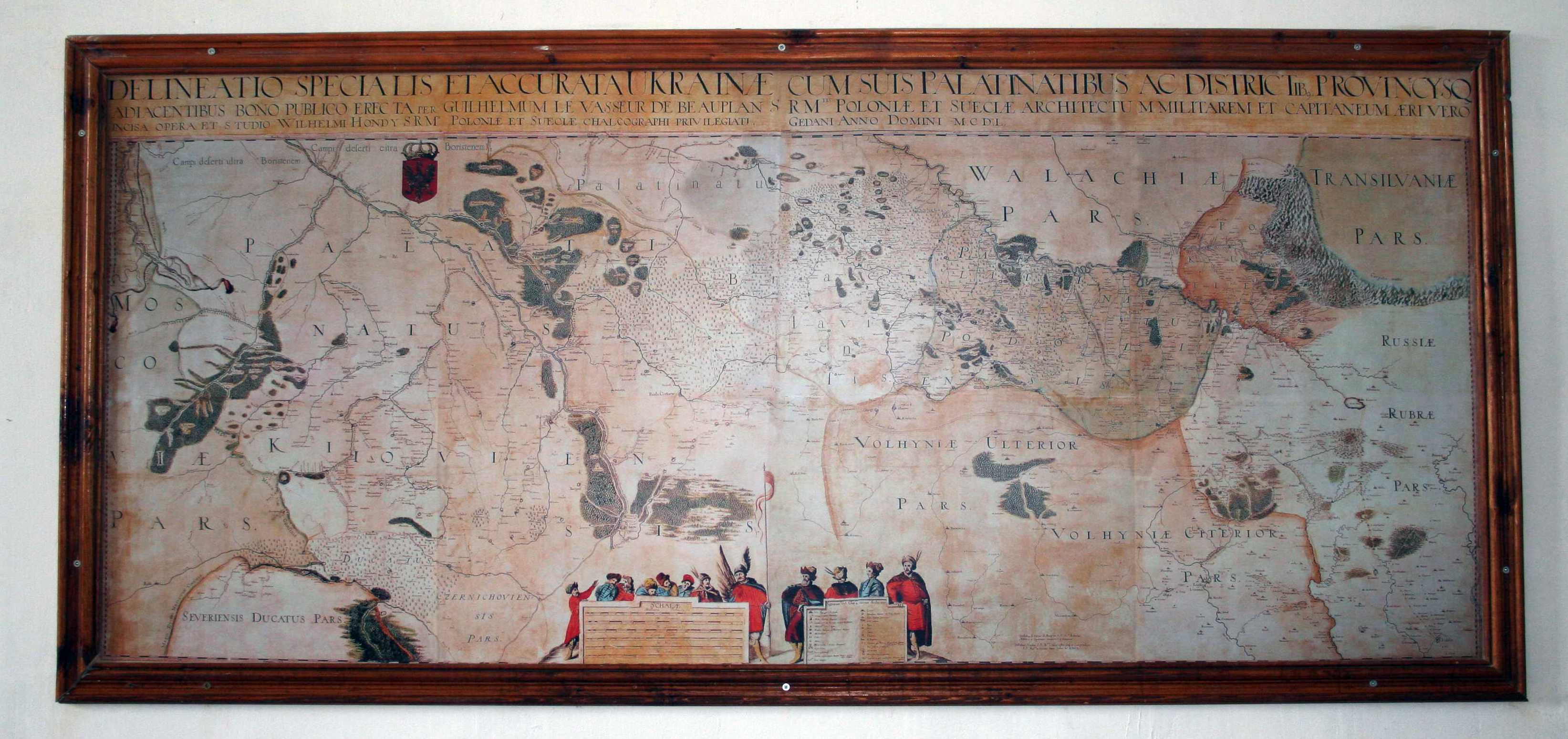 Спеціальна карта України Г. Л. БопланаРозмір зображення: 3287:1549 піксел Фото Зенона Боровця і Богдана Тхора, 13 серпня 2009 р. Оригінальна карта (південь вгорі). На пізніших переробках – північ вгорі, як на сучасних картах. |