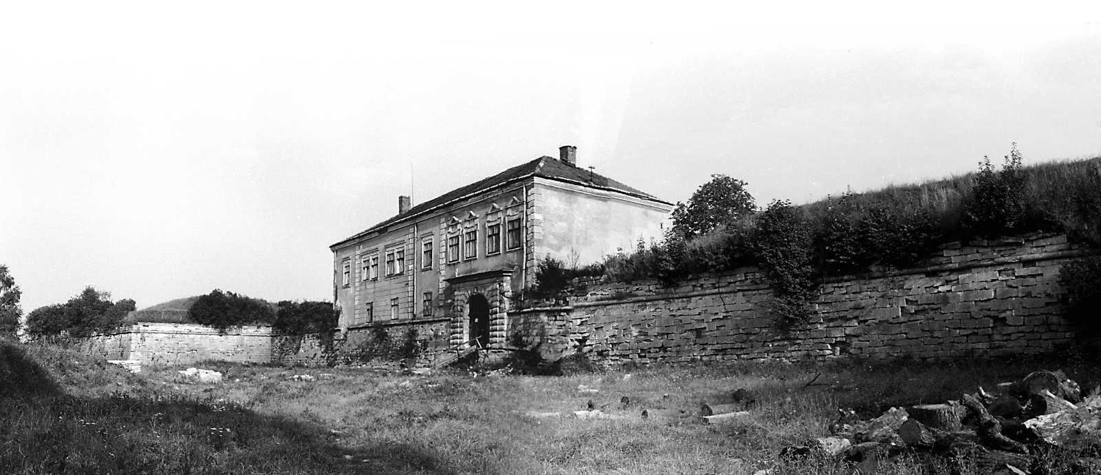 1990 р. Вигляд з північного заходуРозмір зображення: 1600:691 піксел Північно-східний бастіон, надбрамний корпус і північна куртина. 1990 р. 14 серпня. Фото М.І.Жарких. Негатека, № 657-01+2. |