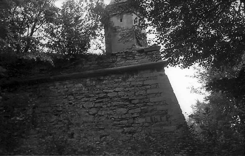 1977 р. Ріг бастіону зі сторожовою башточкою (кавальєром)Розмір зображення: 800:509 піксел 1977 р. 18 липня. Фото М.І.Жарких. Негатека, № A325-36. [Може, південно-східний бастіон – так заріс деревами? Тоді вигляд з південного заходу.] |