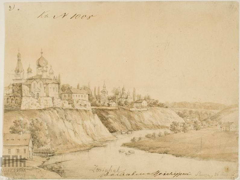 Widok ogólny od strony rzeki Słucz z ruinami zamku Ostrogskich, cerkwią z pięcioma kopułami i wolnostojącą dzwonnicą oraz drugą cerkwią z trzema kopułami i wolnostojącą dzwonnicą. 1862 – 1876. Dat.: 26 Sierp. Napis: Zwiahel; Zwiahel nad Sluczą; napis na podkładzie: Wołyń Zwiahel – cerkwie; napis na kartce doklejonej do podkładu: Zwiahel, Nowogród Wołyński G. Wołyńska. Niegdyś własność W. X. Litewskich – następnie w XV. wieku Xiąźąt Zwiahelskich. Alexander Jagielończyk darował X Konstantemu Ostrogskiemu – Zamek zniszczony w 1648 przez Zygmunta Przyjemskiego w czasie zbuntowanego miasta – Ostatniemi czasy Xięstwo Zwiahelskie należało w części do familij Hr. Potockich; ostatni napis powtórzony w języku francuskim. Rys. ołówkiem podmalowany sepią, 24,5 x 18,5. III-r.a. 4302 (Teka Wołyń). Bibl.: Album widoków, seria II, il. 70. [Katalog rysunków architektonicznych ze zbiorów Muzeum narodowego w Krakowie. 1. Rysunki Napoleona Ordy / Opracowały Zofia Kucielska i Zofia Tobiaszowa. – Warszawa: Państwowe wydawnictwo naukowe, 1975, Nr. 477]