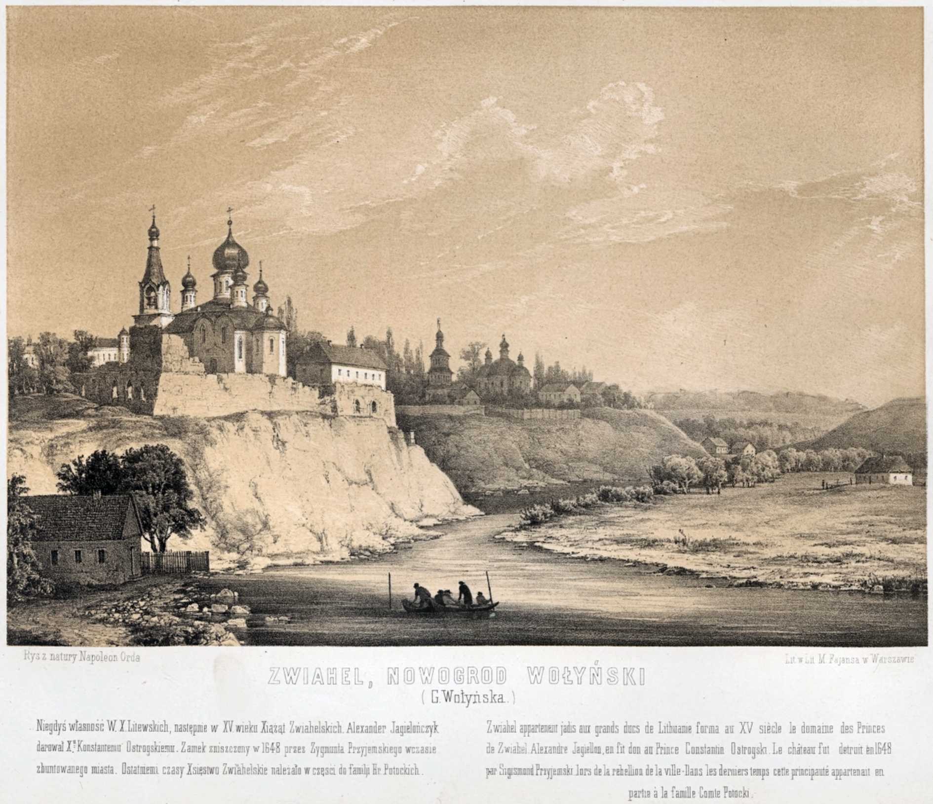 ЛітографіяРозмір зображення: 1890:1630 піксел Літографія панорами Звягеля за рисунком Наполеона Орди . Скан літографії: Orda N. Album widokow historycznych Polski (1873 – 1883), Seria 2, № (1875) |